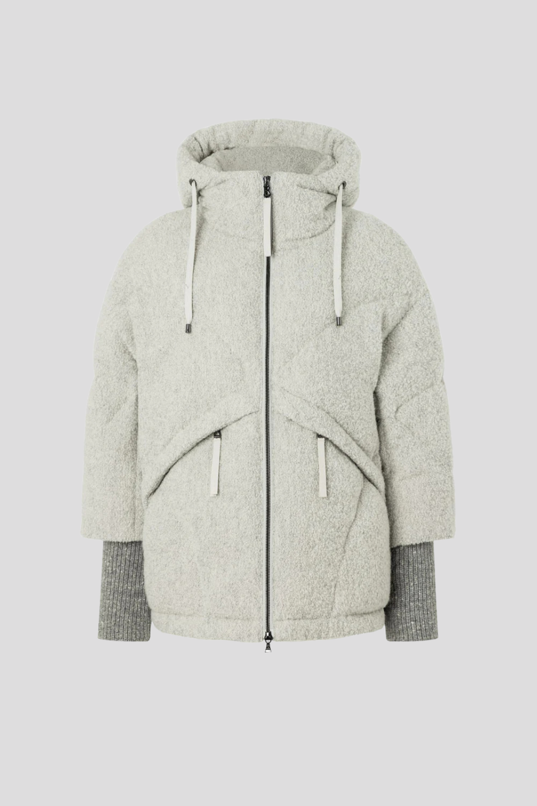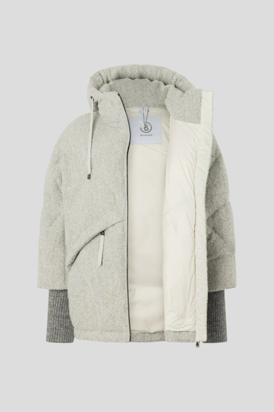 Fixed hood with drawcords and internal brand logo adding a subtle accent to the high-end craftsmanship