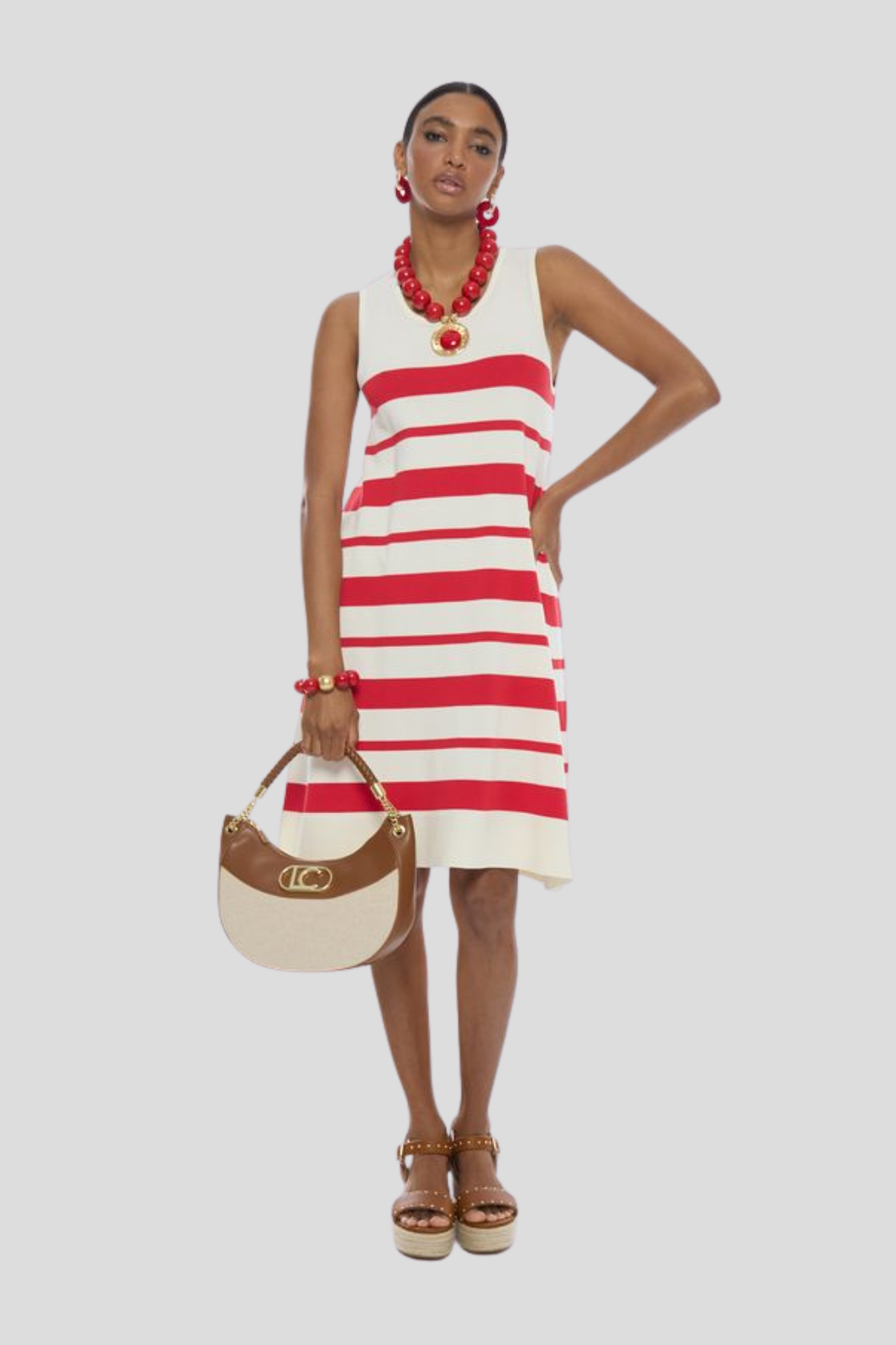 Къса плетена рокля с широки презрамки и класически А-силует, завършена с асиметричен подгъв, който придава динамика на линията