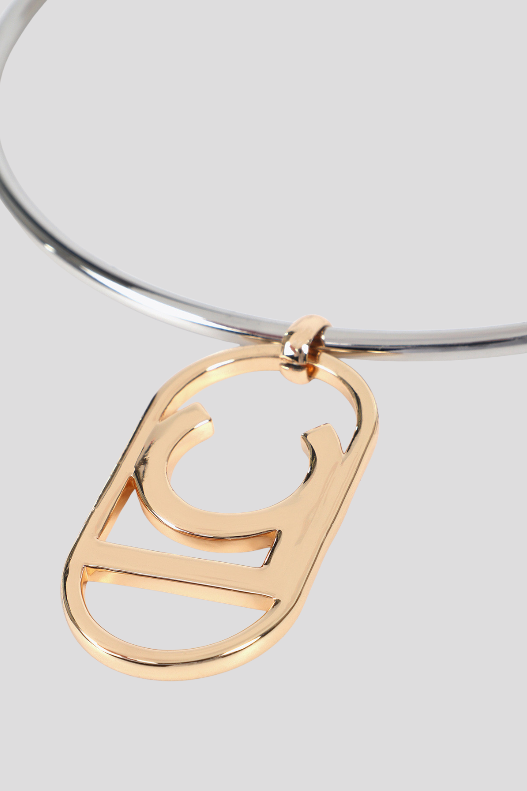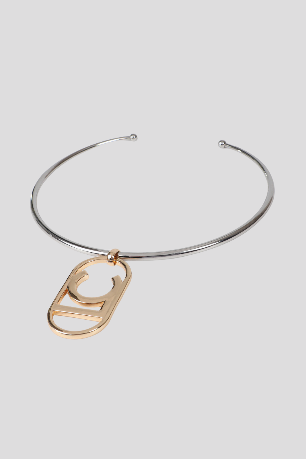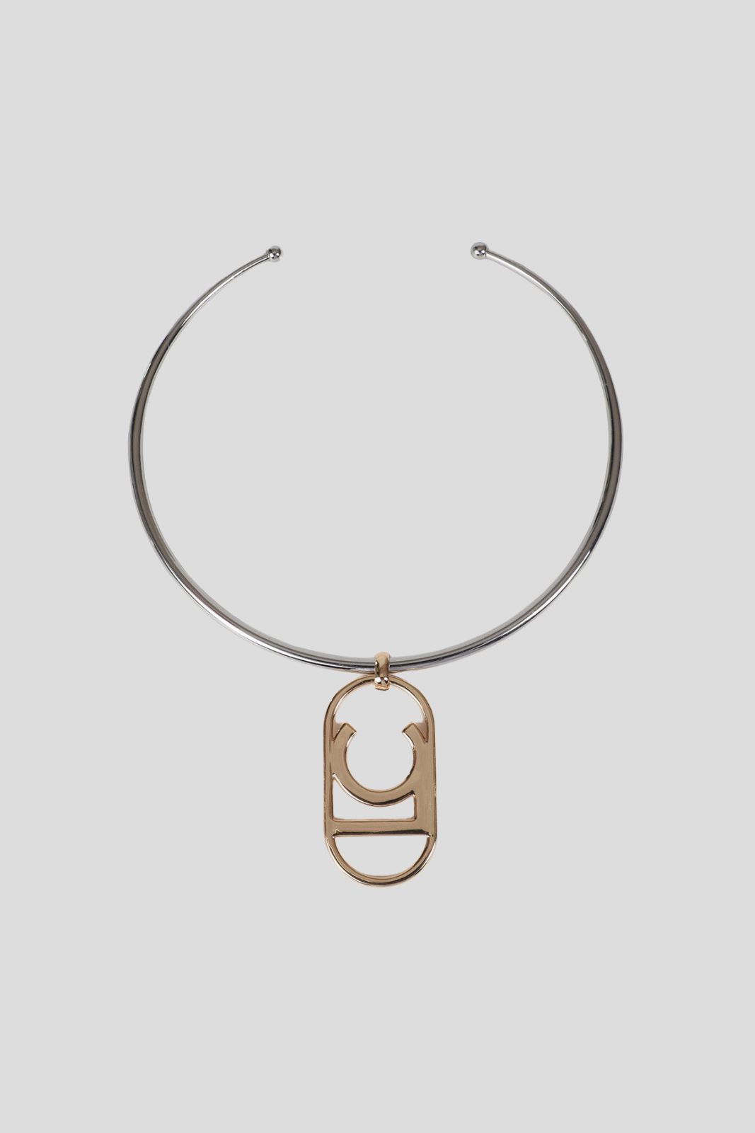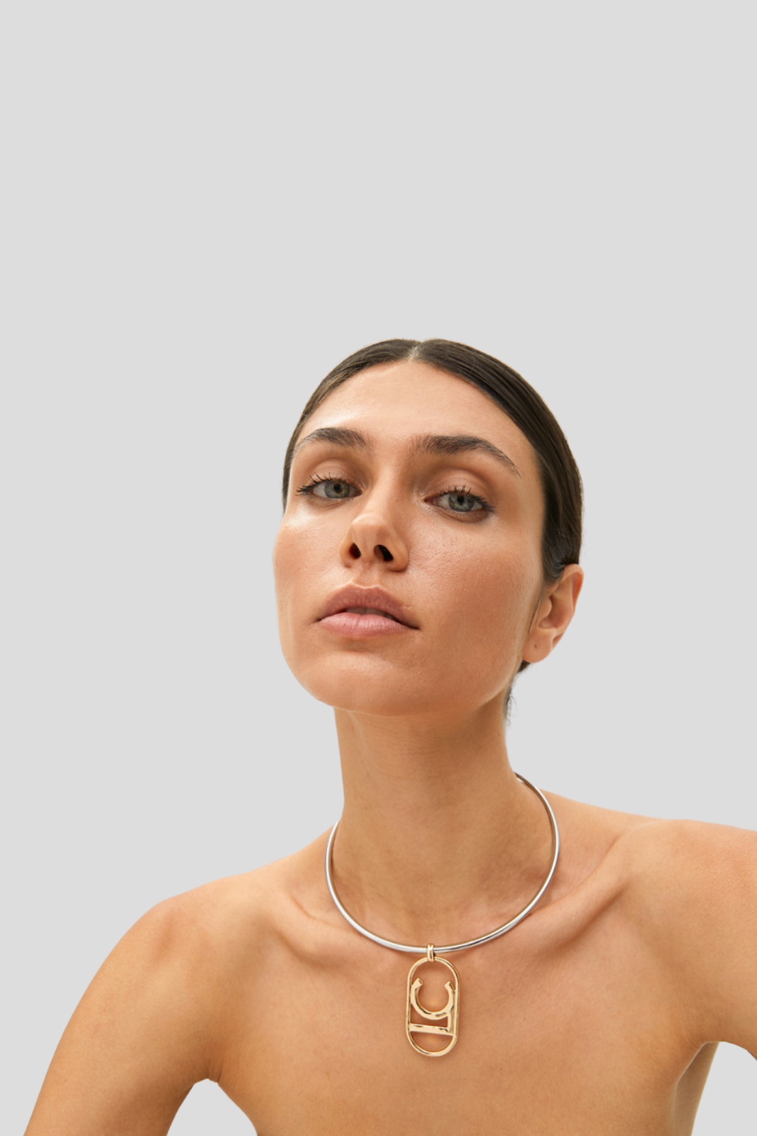 Късо твърдо колие с минималистичен дизайн и овален медальон с логотип