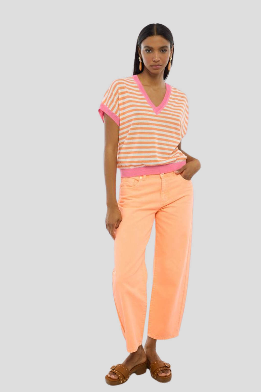 Пуловер в класически силует с къси ръкави, декориран с изискано двуцветно райе — съвършено съчетание на минимализъм и визуална динамика
