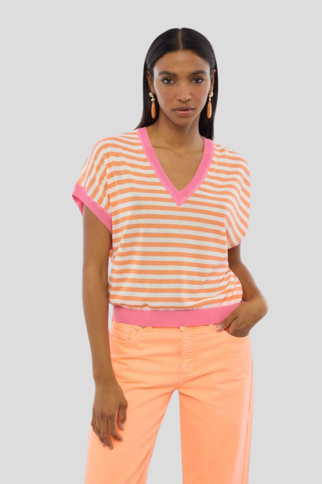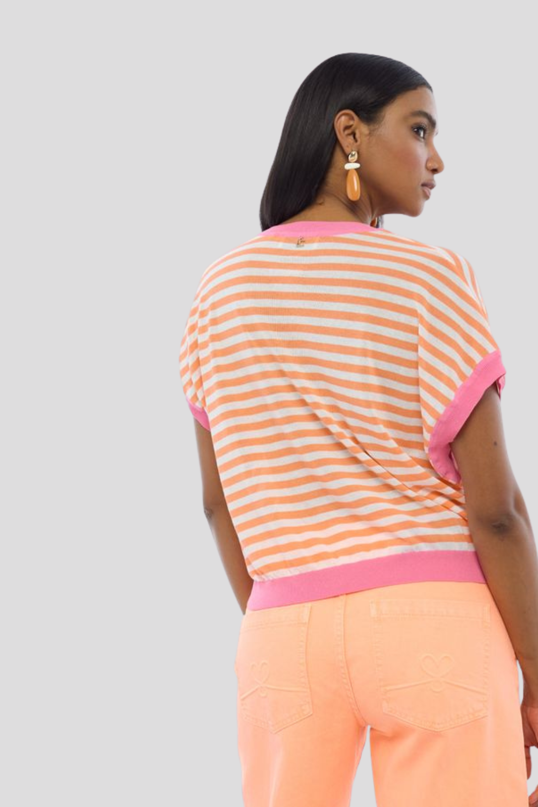 Пуловер в класически силует с къси ръкави, декориран с изискано двуцветно райе — съвършено съчетание на минимализъм и визуална динамика