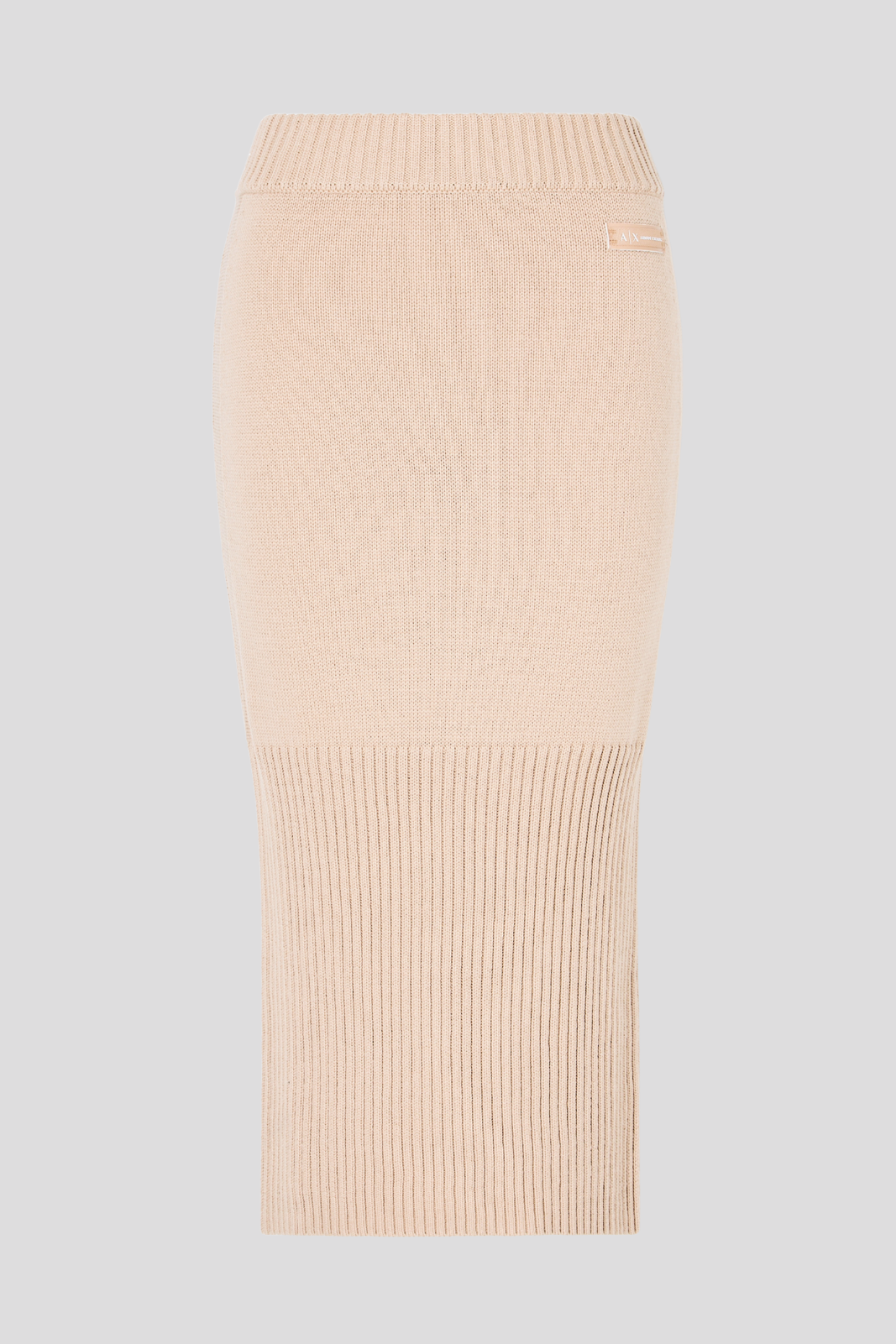 Рипсена плетена пола тип миди — с елегантно втален силует, дължина до коляното и фино лого, което подчертава ненатрапчивия лукс на детайла.