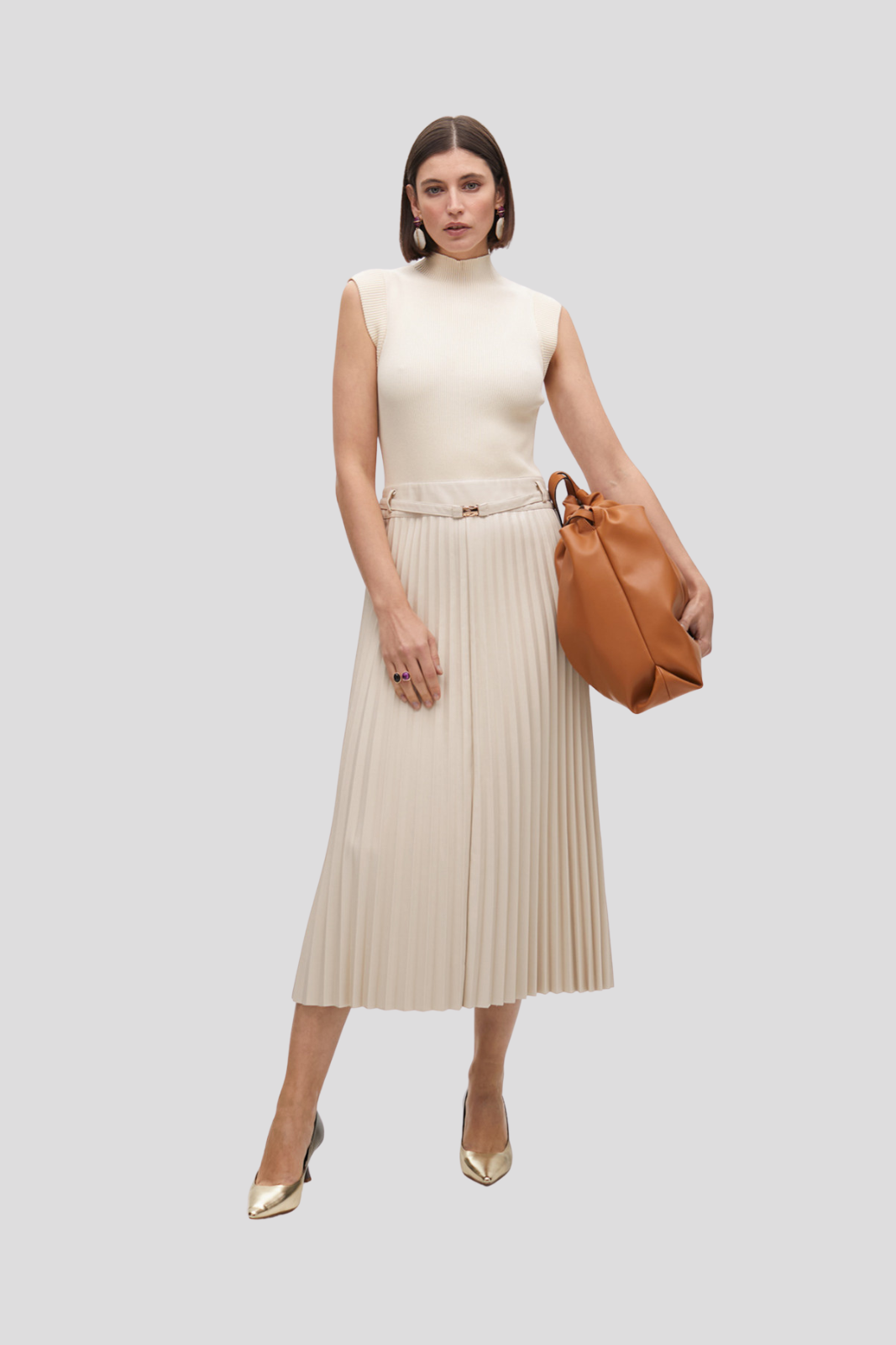 This midi dress impresses with its exquisite pleated skirt