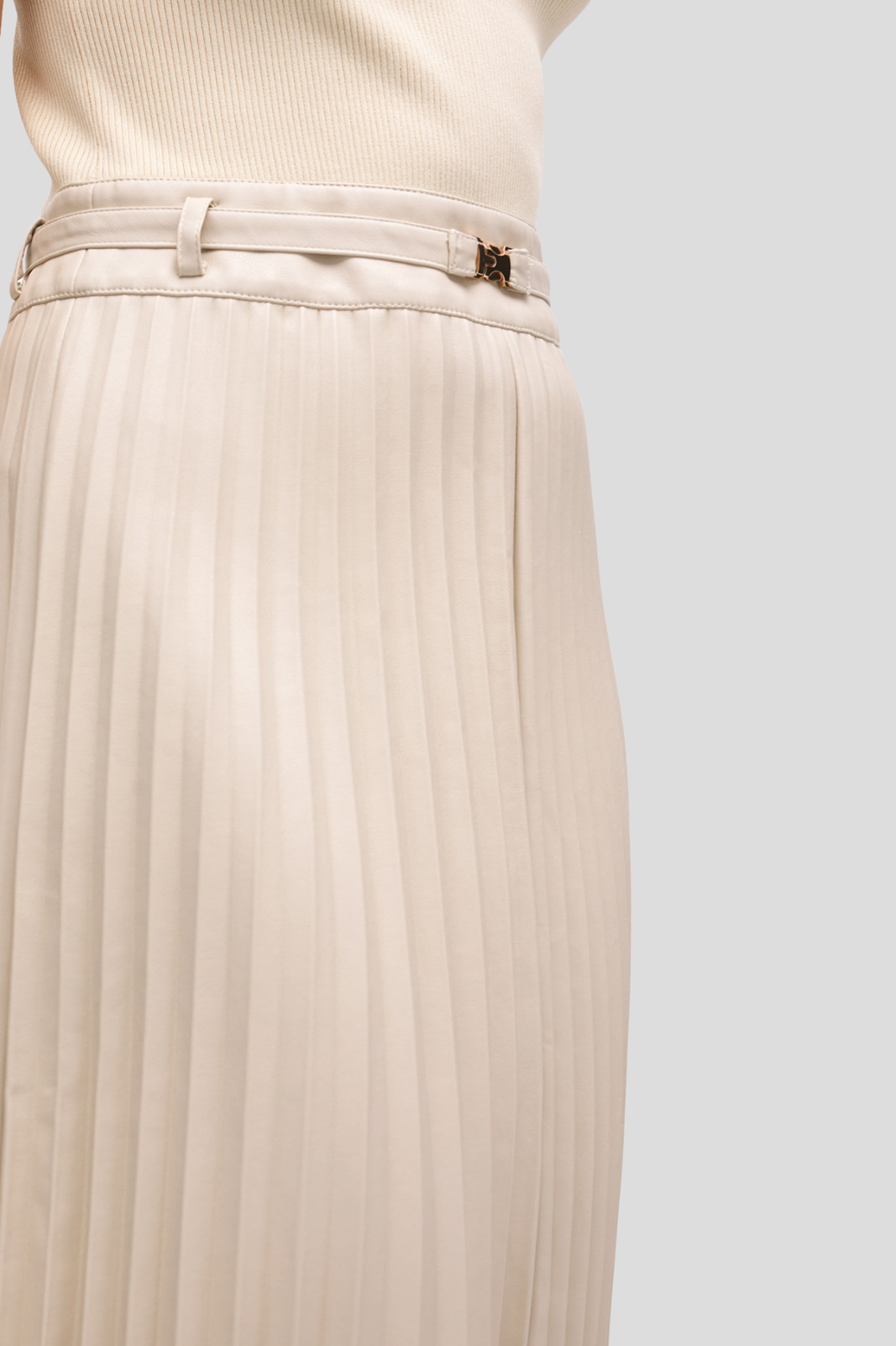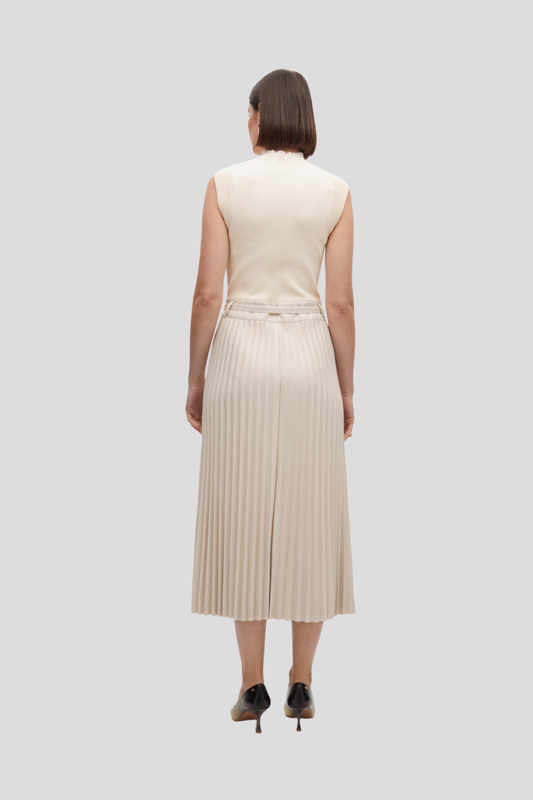 This midi dress impresses with its exquisite pleated skirt
