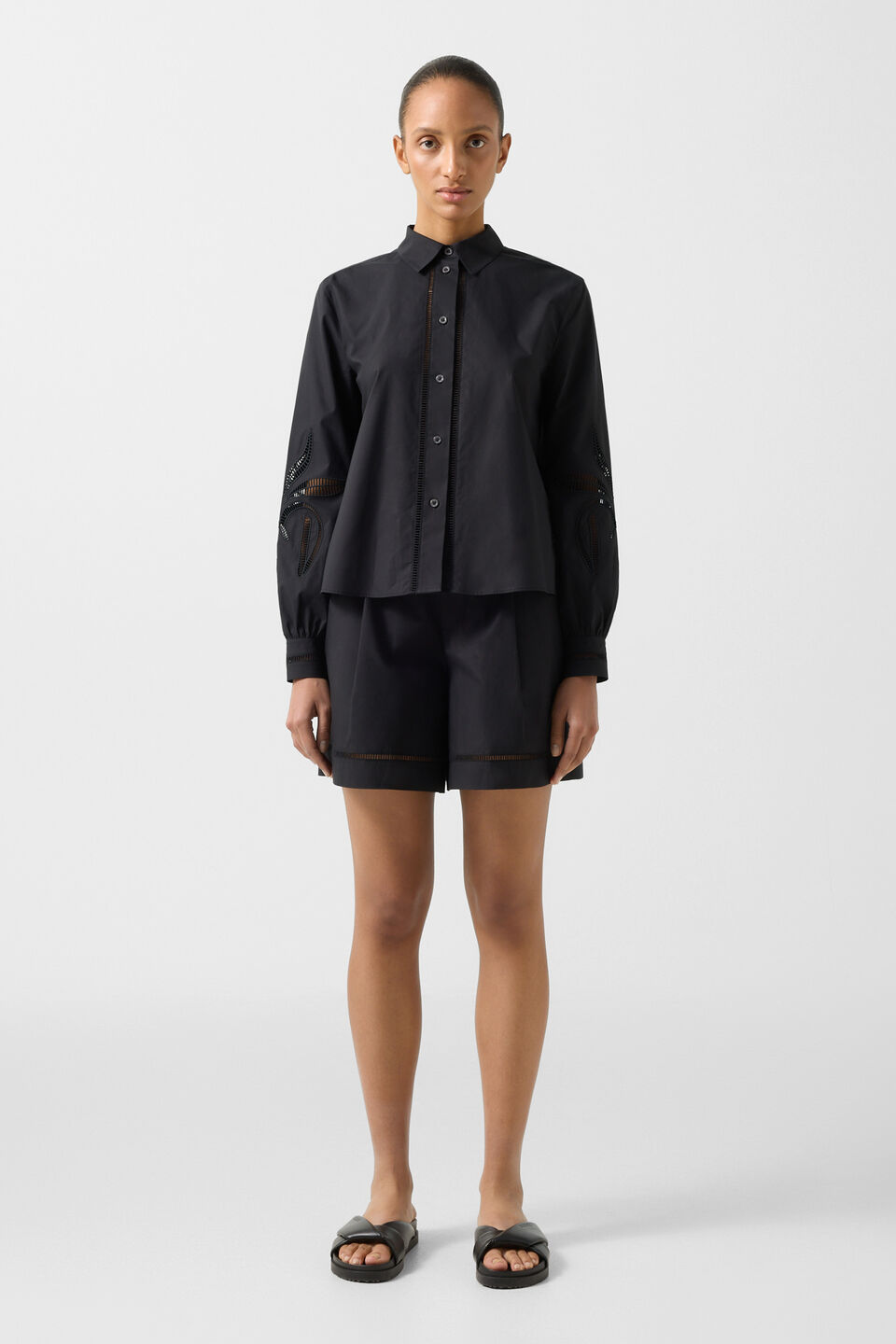Trousers fasten with two tic-tac buttons, a concealed hook and zip, creating a neat and tidy silhouette
