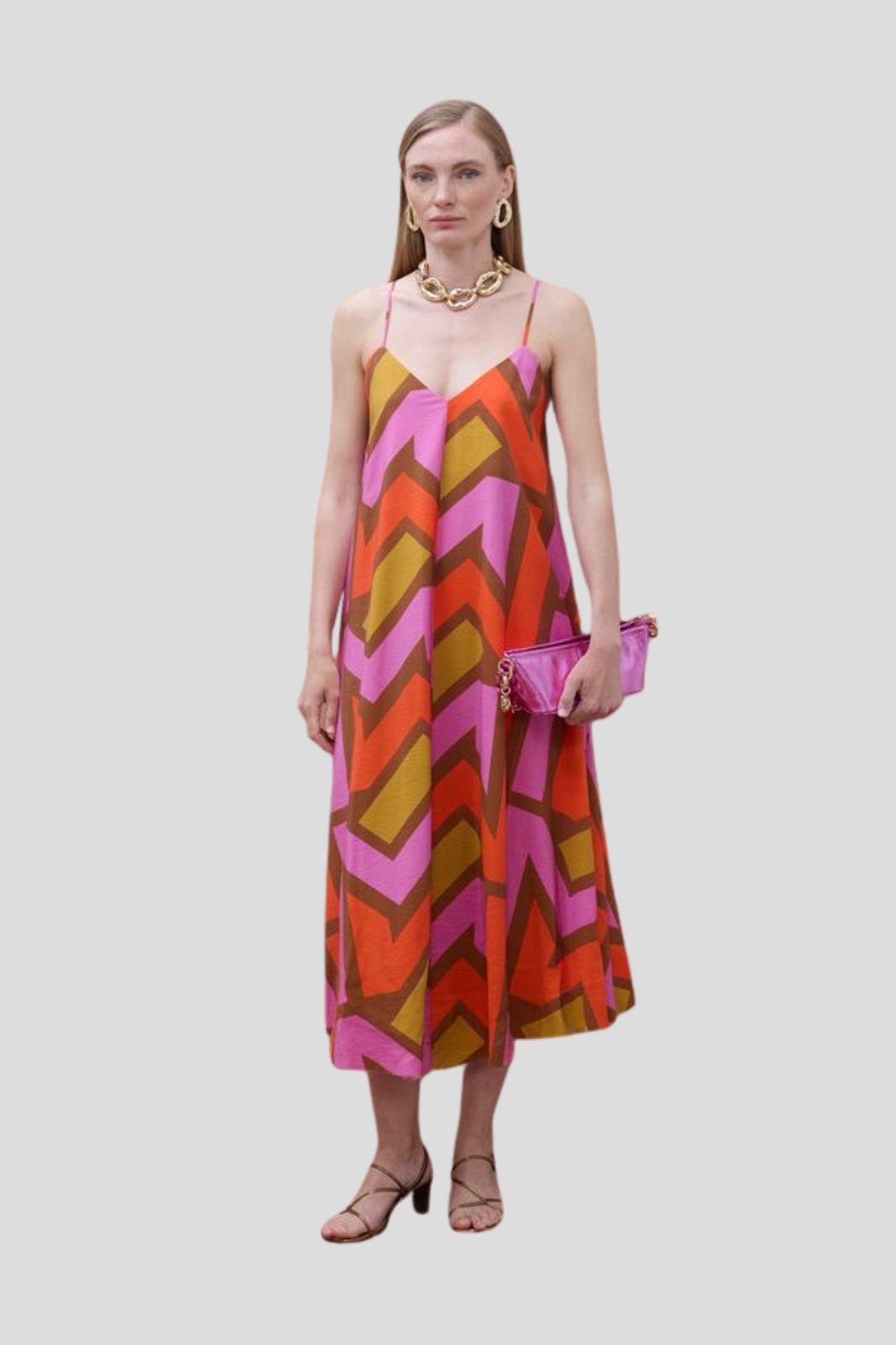 Рокля с тънки презрамки и V-образно деколте в класически силует, акцентирана с лого, излъчващо стил и елегантност