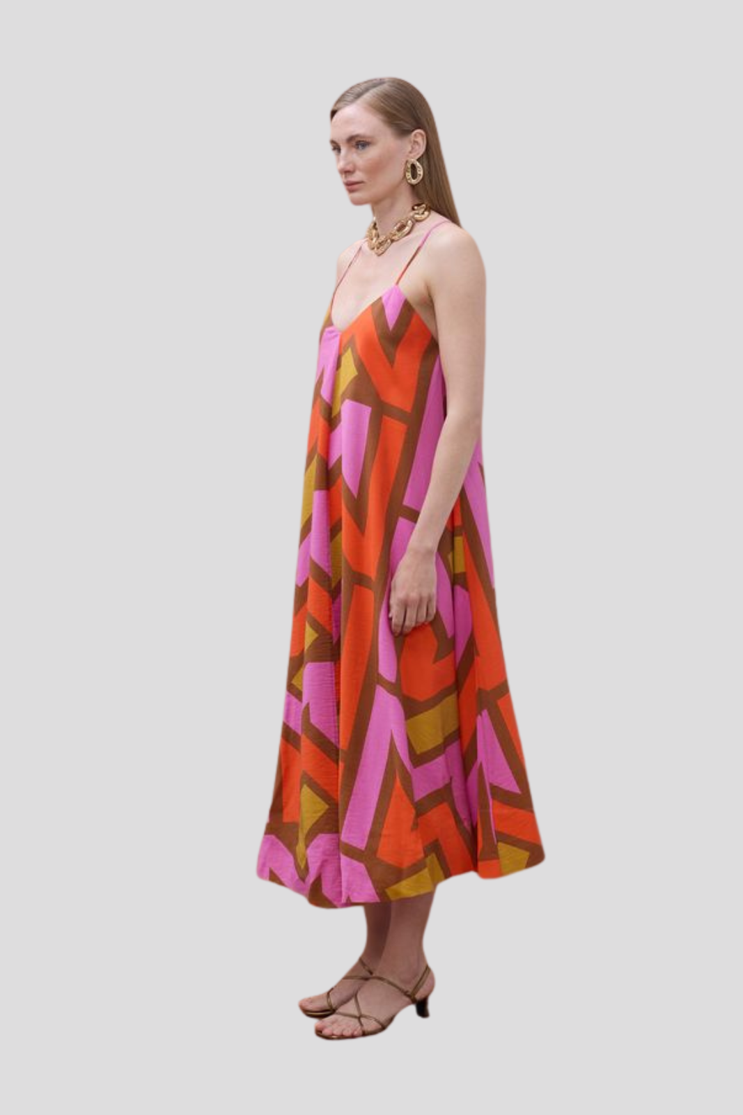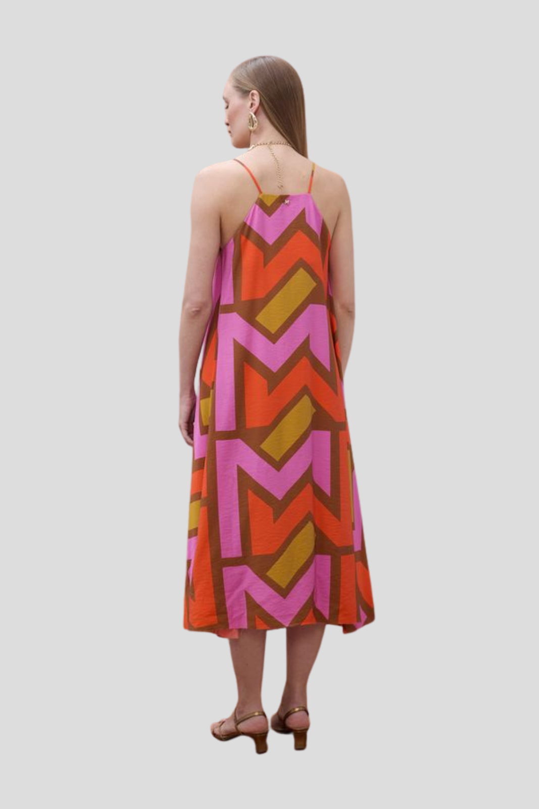 Рокля с тънки презрамки и V-образно деколте в класически силует, акцентирана с лого, излъчващо стил и елегантност