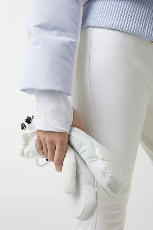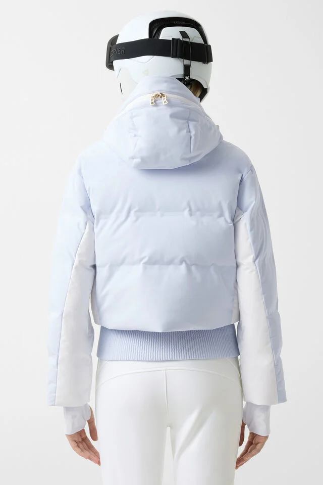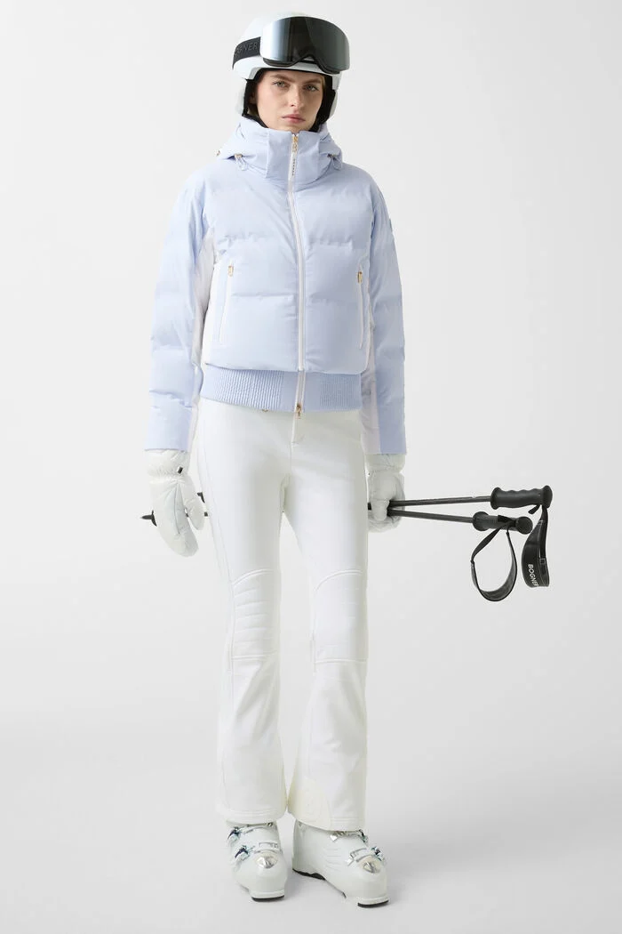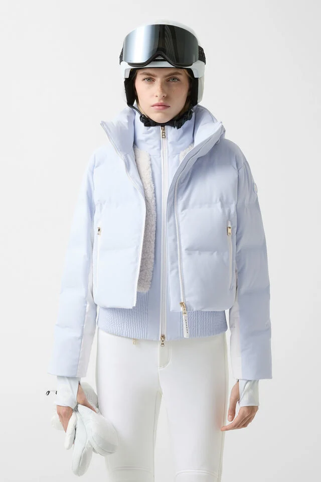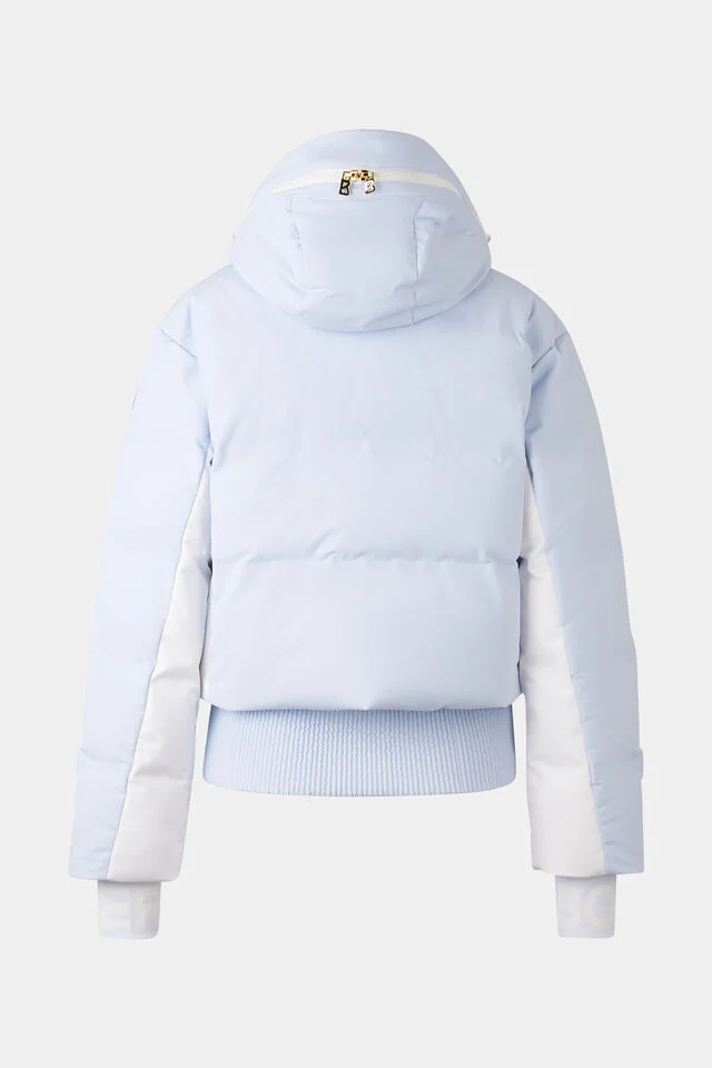 Quilted 2-in-1 ski jacket in a classic silhouette padded collar with straight waist removable hood with drawstring stopper and zip with BOGNER print long sleeves cuffs on sleeves with inner elastic thumb strap with logo design fastens with B-strap back panel with logo zipped ski card pocket on sleeve two side zipped pockets inner pocket waterproof zippers Aquaguard B-rubber sleeve patch inner logo ribbon and brown fabric with smooth lining and flame print removable plush vest with smooth tech parts stand-up collar waistband padded two-way zipper side pockets with piping and hem with attached ribbed cuff as a snow cuff durable water repellent coating water column 20,000 mm breathability 20,000 g per m² per 24 hours warming goose down lining and tech fibres hem with drawcords and stopper back length 50 cm