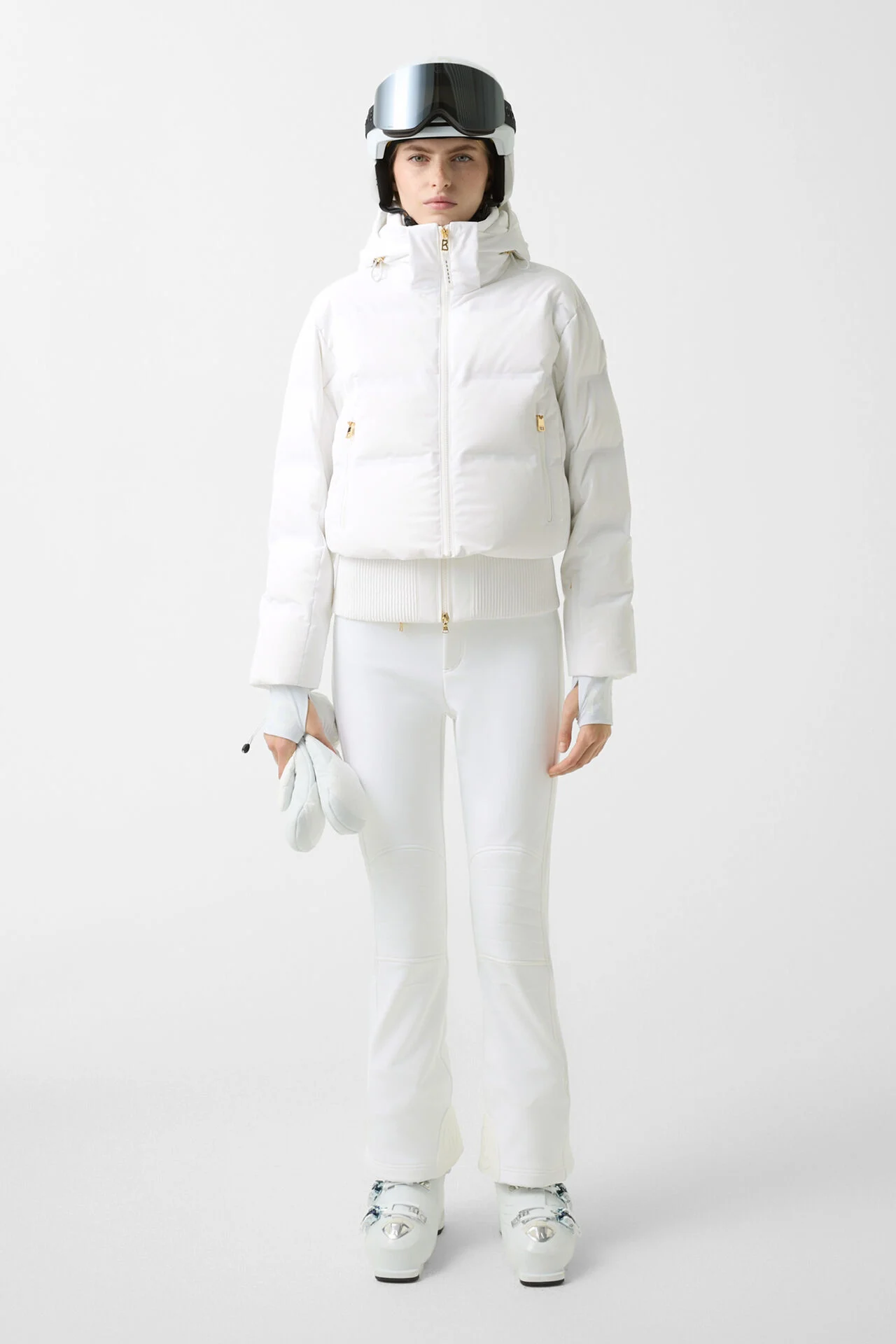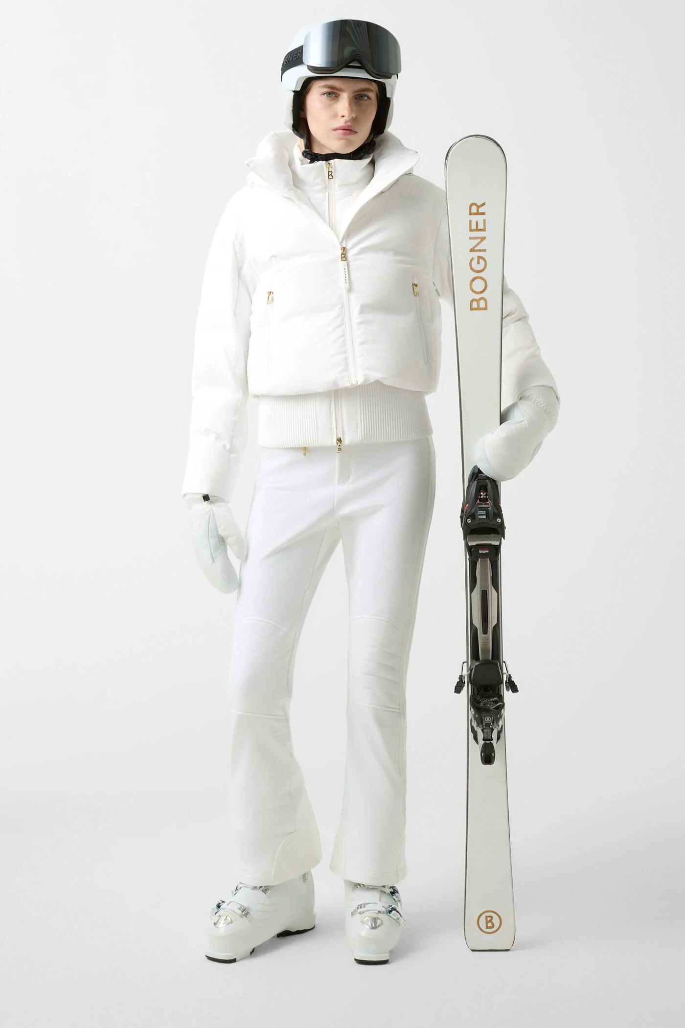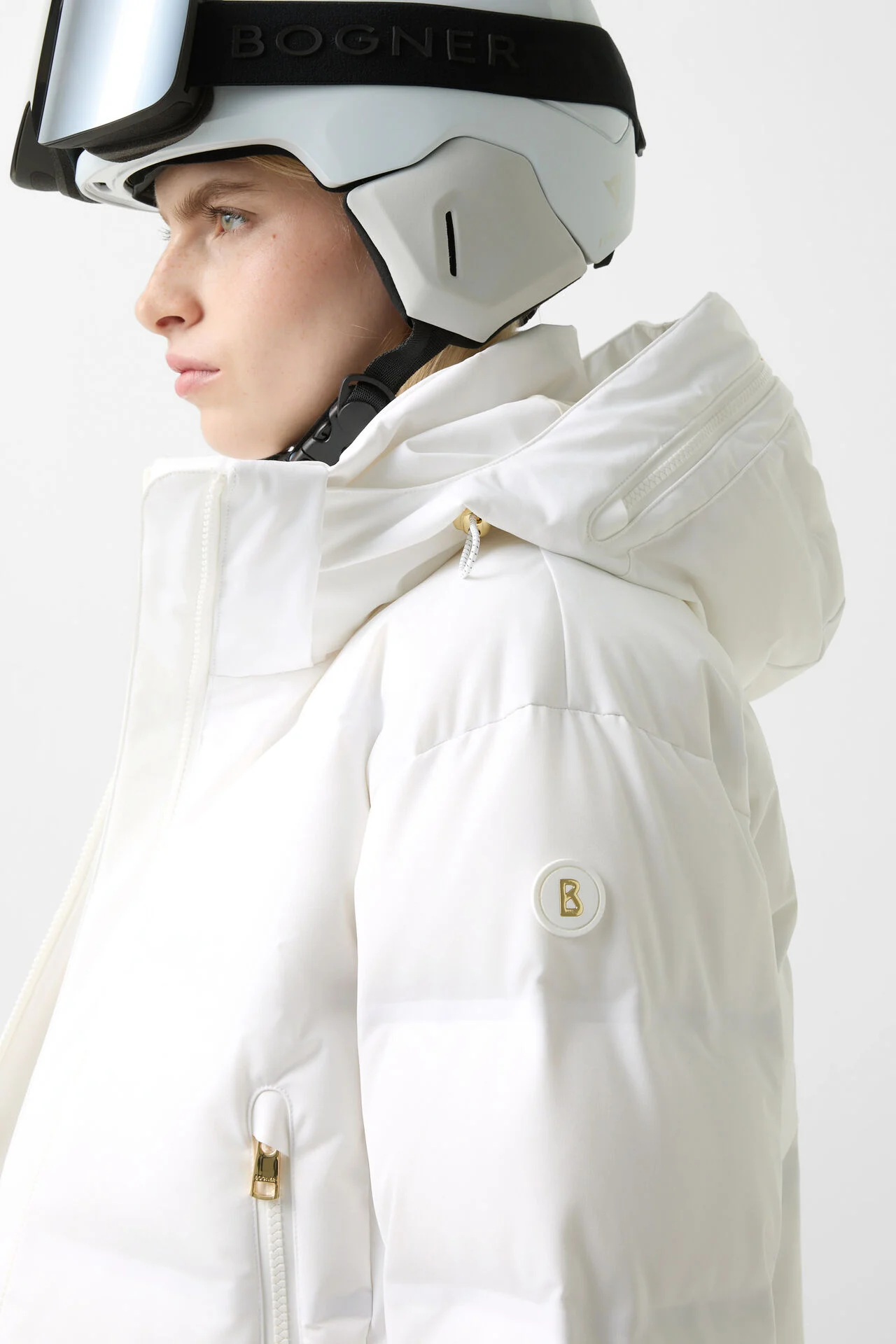 Vatted 2-in-1 ski jacket in classic silhouette padded collar with straight waist removable hood with drawstring stopper and zip with BOGNER print long sleeves cuffs on sleeves with inner elastic thumb strap with logo design fastens with B-zipper back logo panel ski card pocket zippered sleeve two side zippered pockets inside pocket waterproof Aquaguard zippers B-rubber patch on sleeve inner logo ribbon and brown fabric with smooth lining and flame print removable plush vest with smooth tech parts stand-up collar waistband padded two-way zipper side pockets with piping and hem with attached ribbed cuff as a snow cuff durable water-repellent coating water column 20,000 mm breathability 20,000 g per m² per 24 hours warming goose down lining and tech fibres hem with drawcords and stopper back length 50 cm