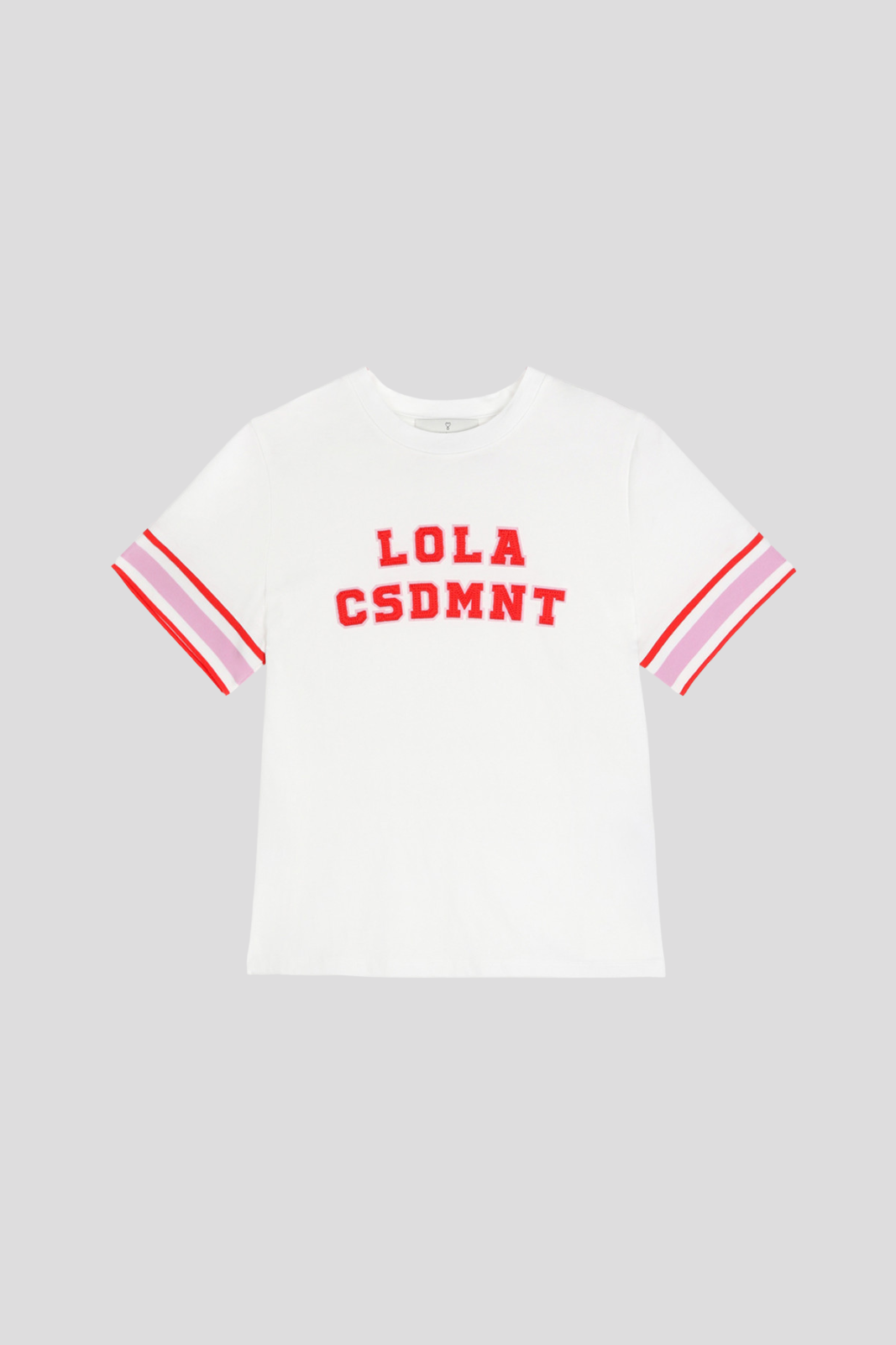 Бяла памучна тениска с рипс детайл на ръкавите и лого Lola Casademunt. отпред