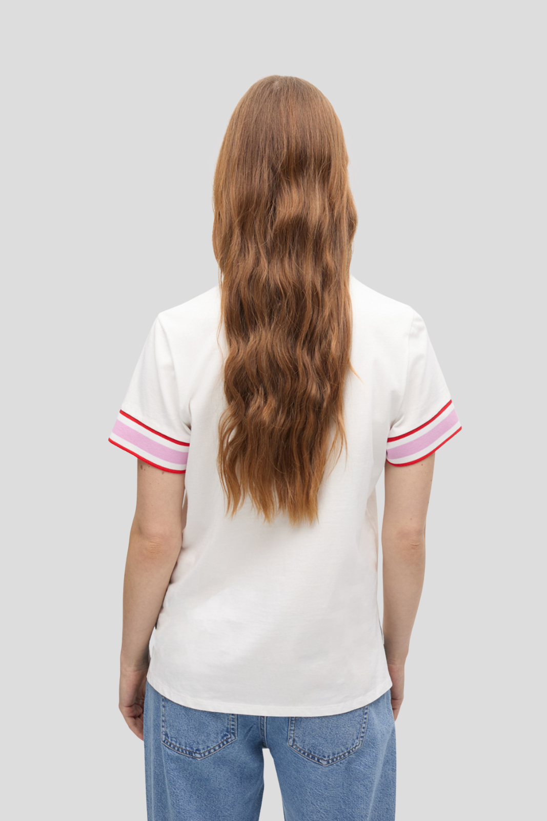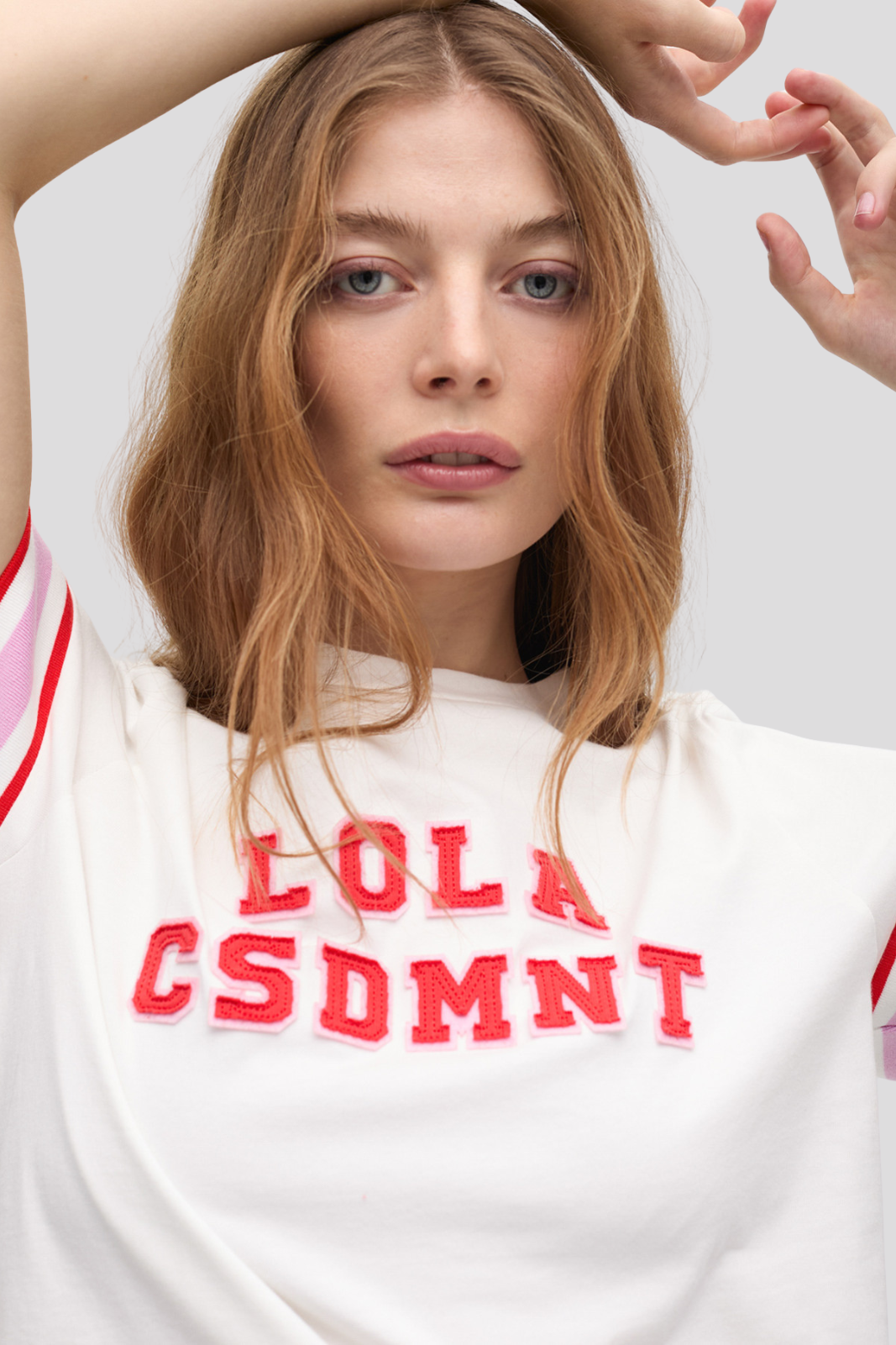Бяла памучна тениска с рипс детайл на ръкавите и лого Lola Casademunt. отпред