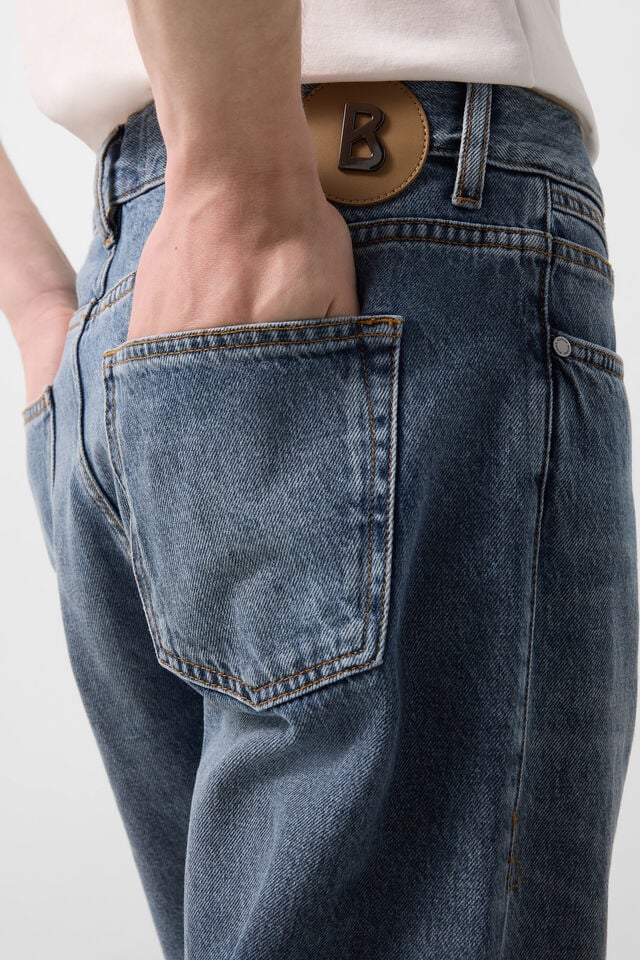 The design includes five pockets – two front pockets, a large coin pocket and two back pockets with patches highlighted with logo rivets and a leather patch on the back for a distinctive brand accent