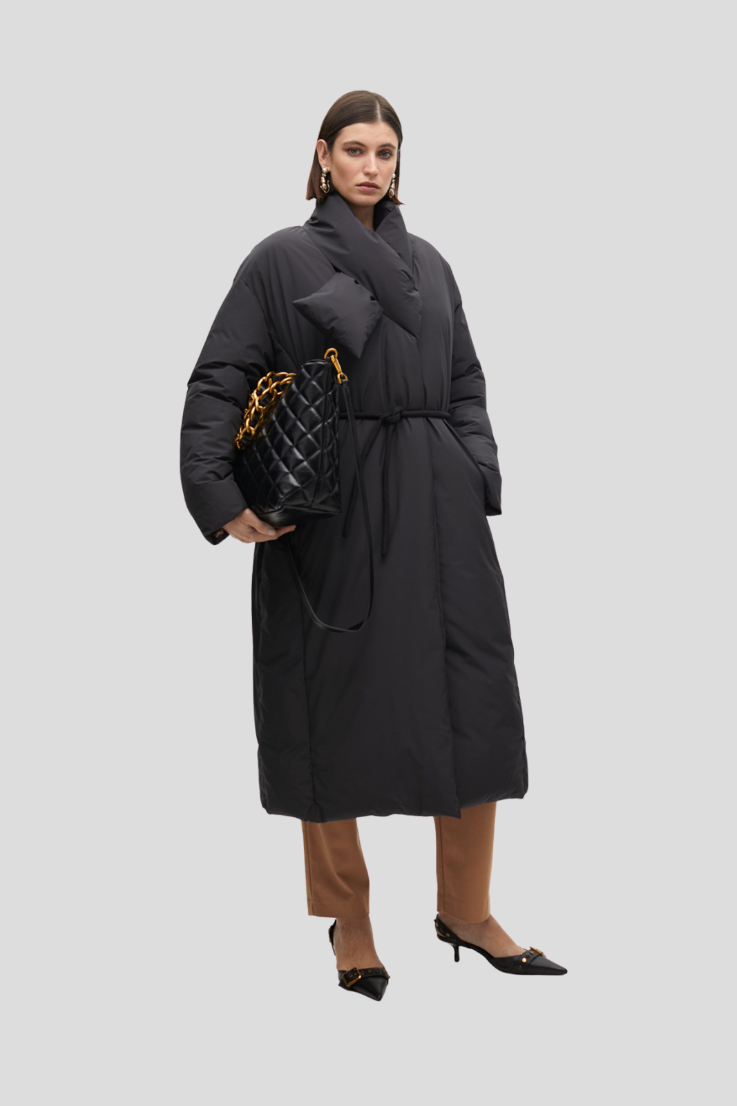 A lined coat sophisticatedly designed with a modern asymmetric collar and elegant adjustable belt with ties