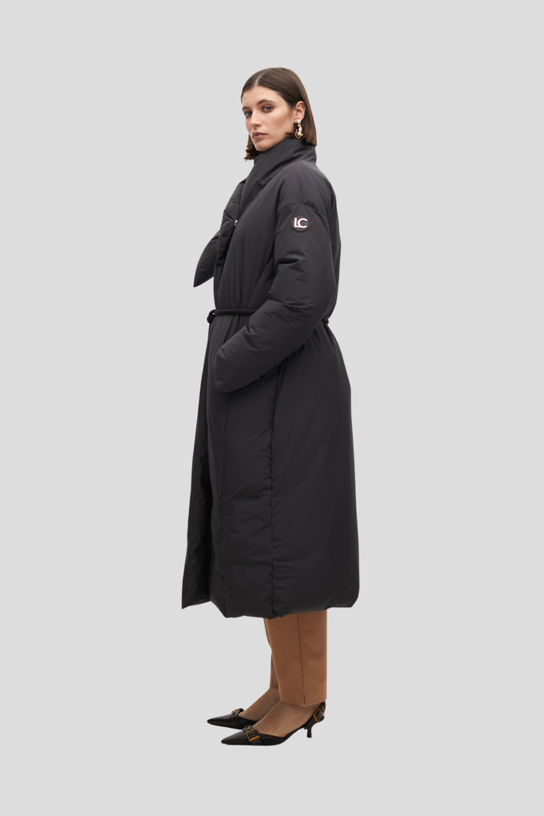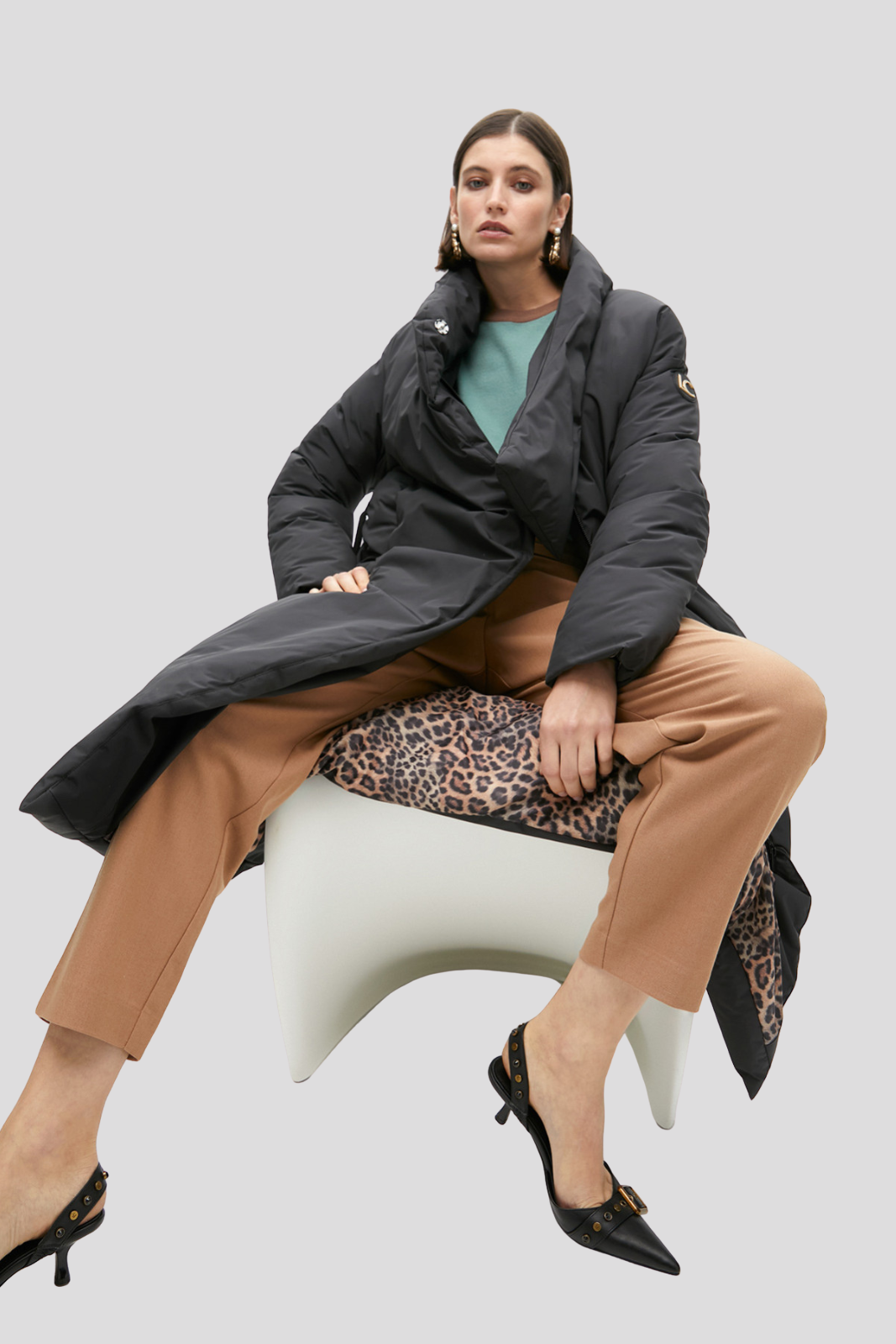 A lined coat sophisticatedly designed with a modern asymmetric collar and elegant adjustable belt with ties