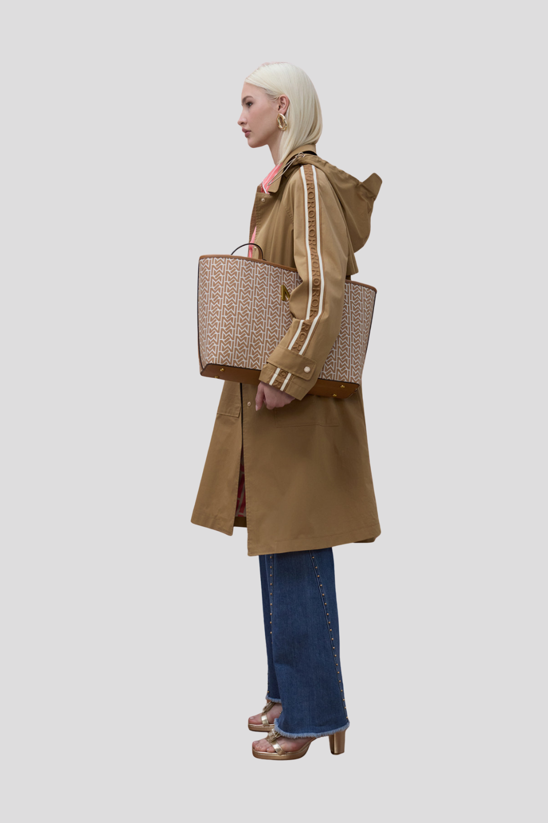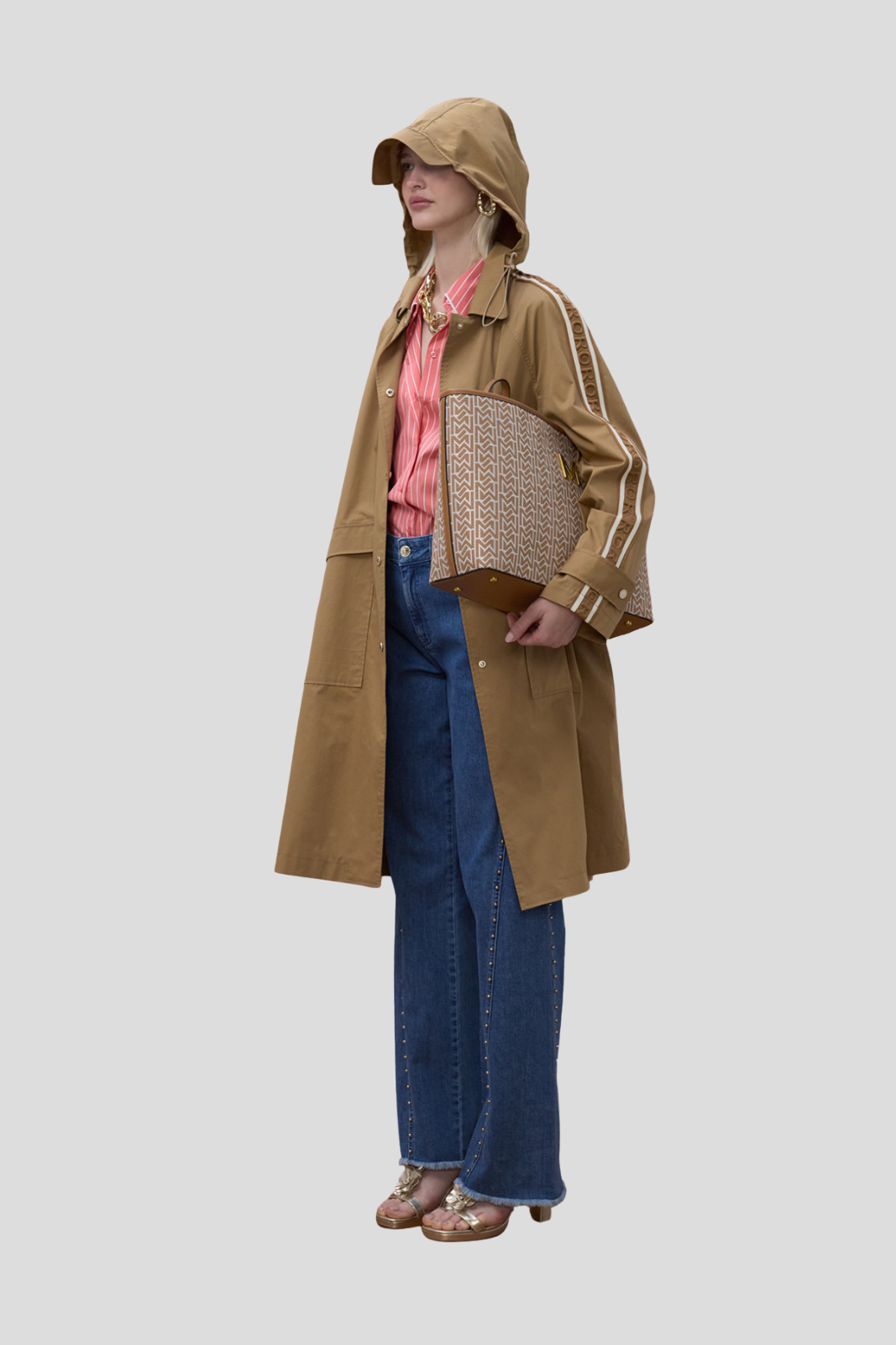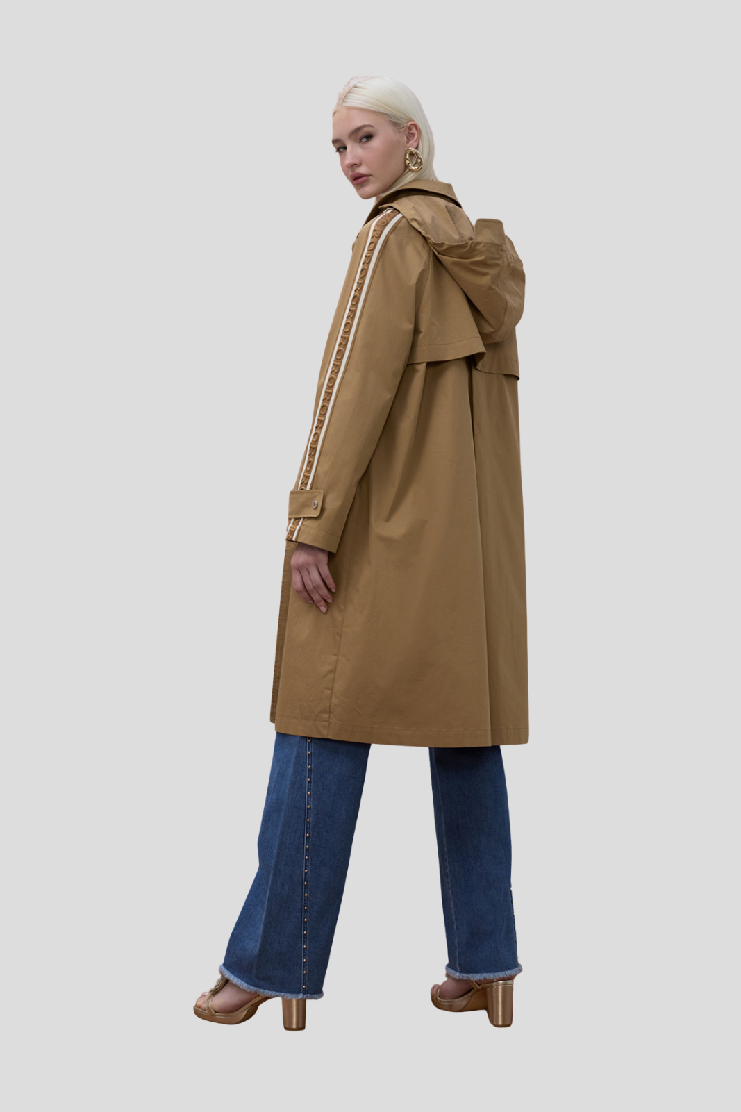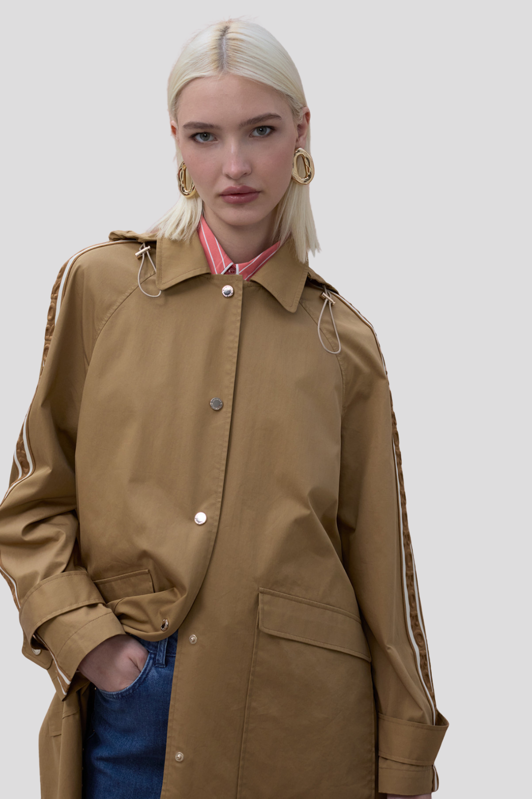 Овърсайз тренч палто в цвят камел с индивидуални ленти по ръкавите за модерен акцент