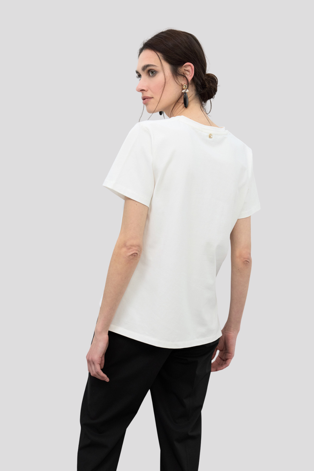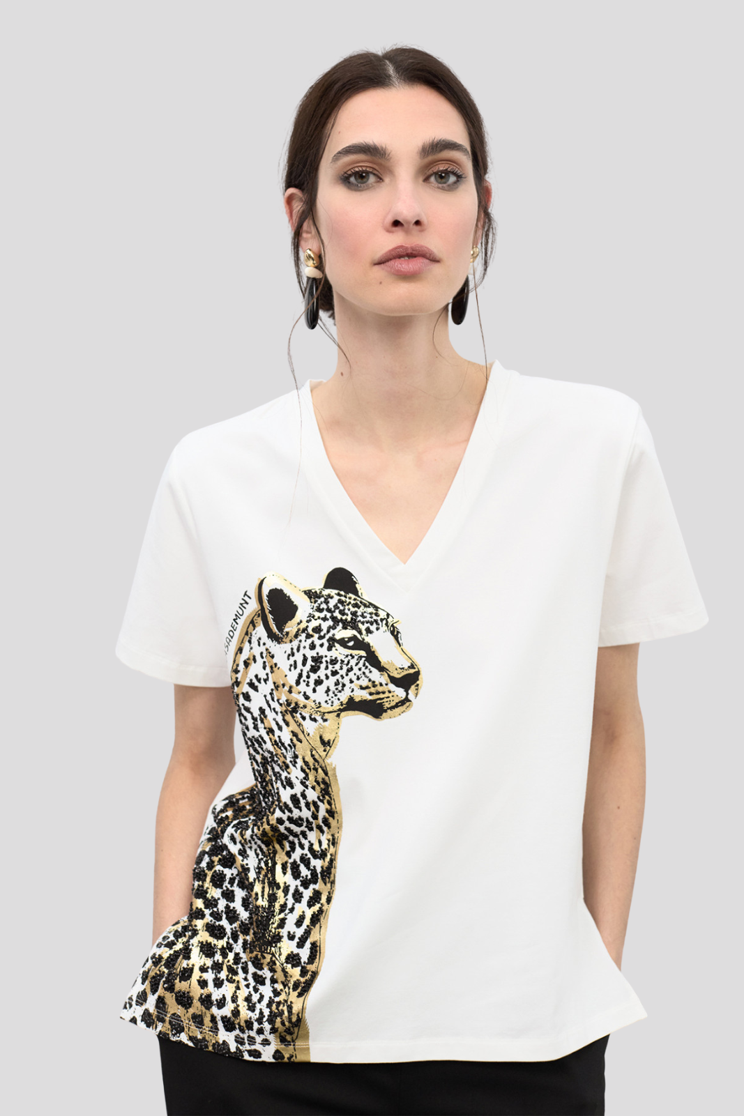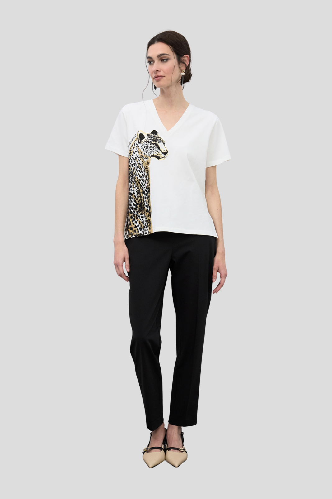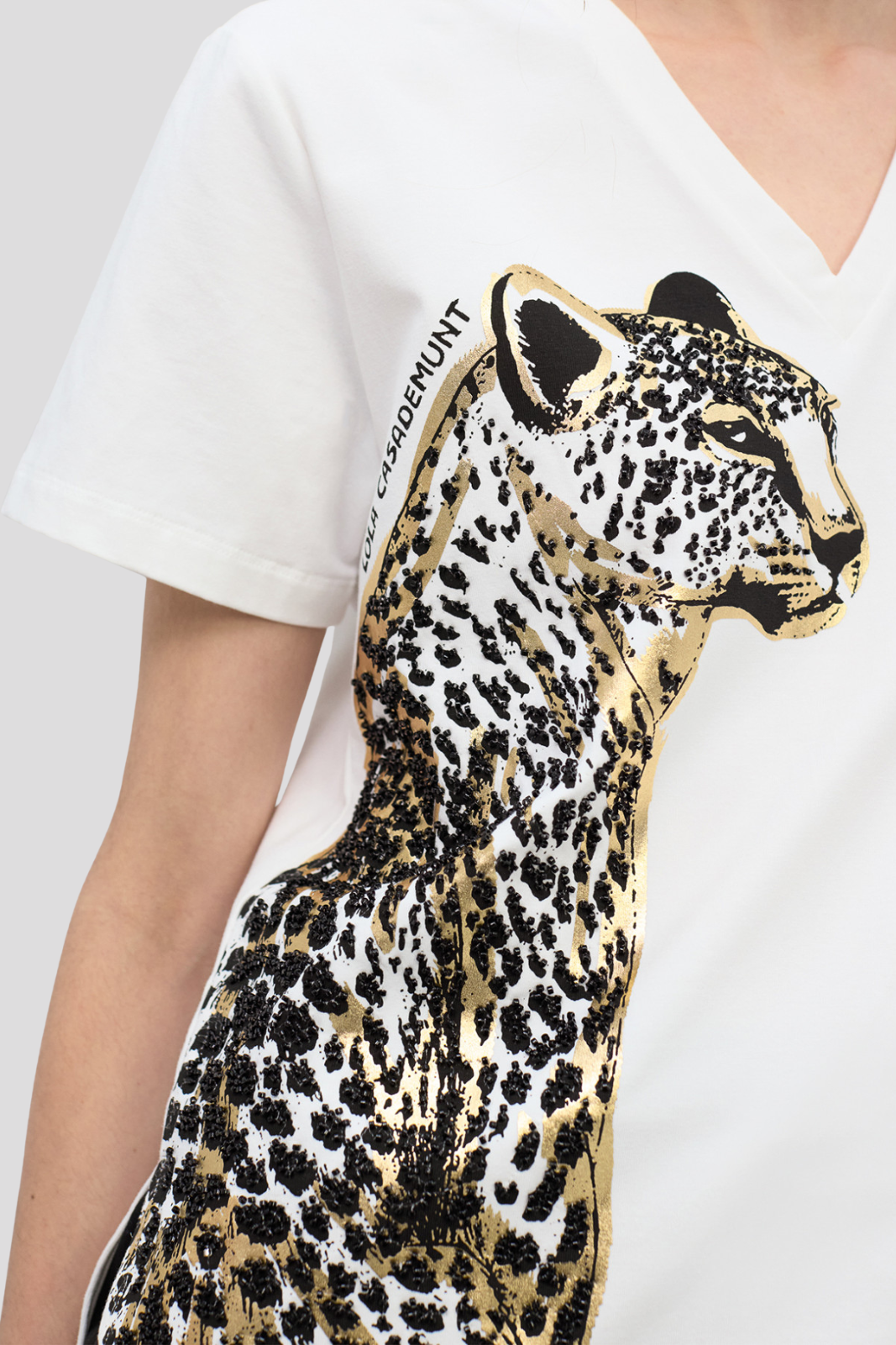 Мека памучна тениска с V-образно деколте, акцентирана с впечатляващ анималистичен принт и декоративни мъниста