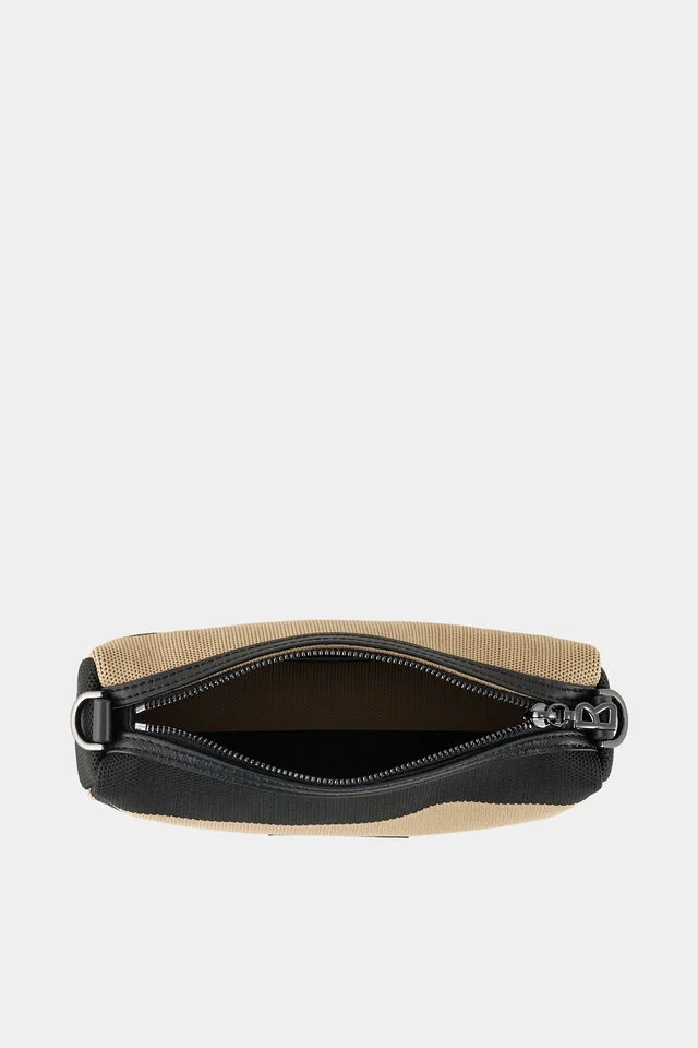 Adjustable jacquard shoulder strap with carabiner and logo offers comfort and style when worn, while an additional logo pocket adds a subtle luxury accent