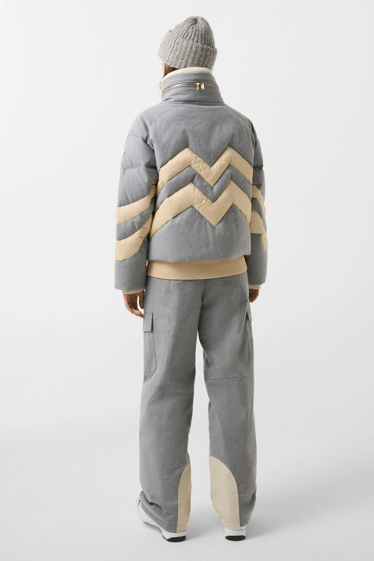 Luxurious women’s ski jacket with refined W-style quilting, combining modern aesthetics with impeccable functionality. The filling of premium goose down and feathers ensures exceptional warmth and comfort, while the sophisticated double collar impresses with its padded design and soft teddy effect for refined cold-weather protection. Long sleeves with integrated ribbed cuffs create a precise fit, and the fastening with a B-zip and signature BOGNER trim highlights the attention to detail. Discreet pockets – side zip pockets, a ski pass pocket on the sleeve, and an inner pocket – combine elegance with practicality. The slightly dropped shoulders and the iconic rubber logo patch on the sleeve add distinction and character. Advanced craftsmanship with a water resistance of 5,000 mm and breathability of 10,000 g/m²/24h ensures reliable protection in extreme conditions. The inner snow skirt with press studs and the hem with adjustable drawstring and stopper provide adaptability and comfort, while the back length of 66 cm offers a refined balance to the silhouette.