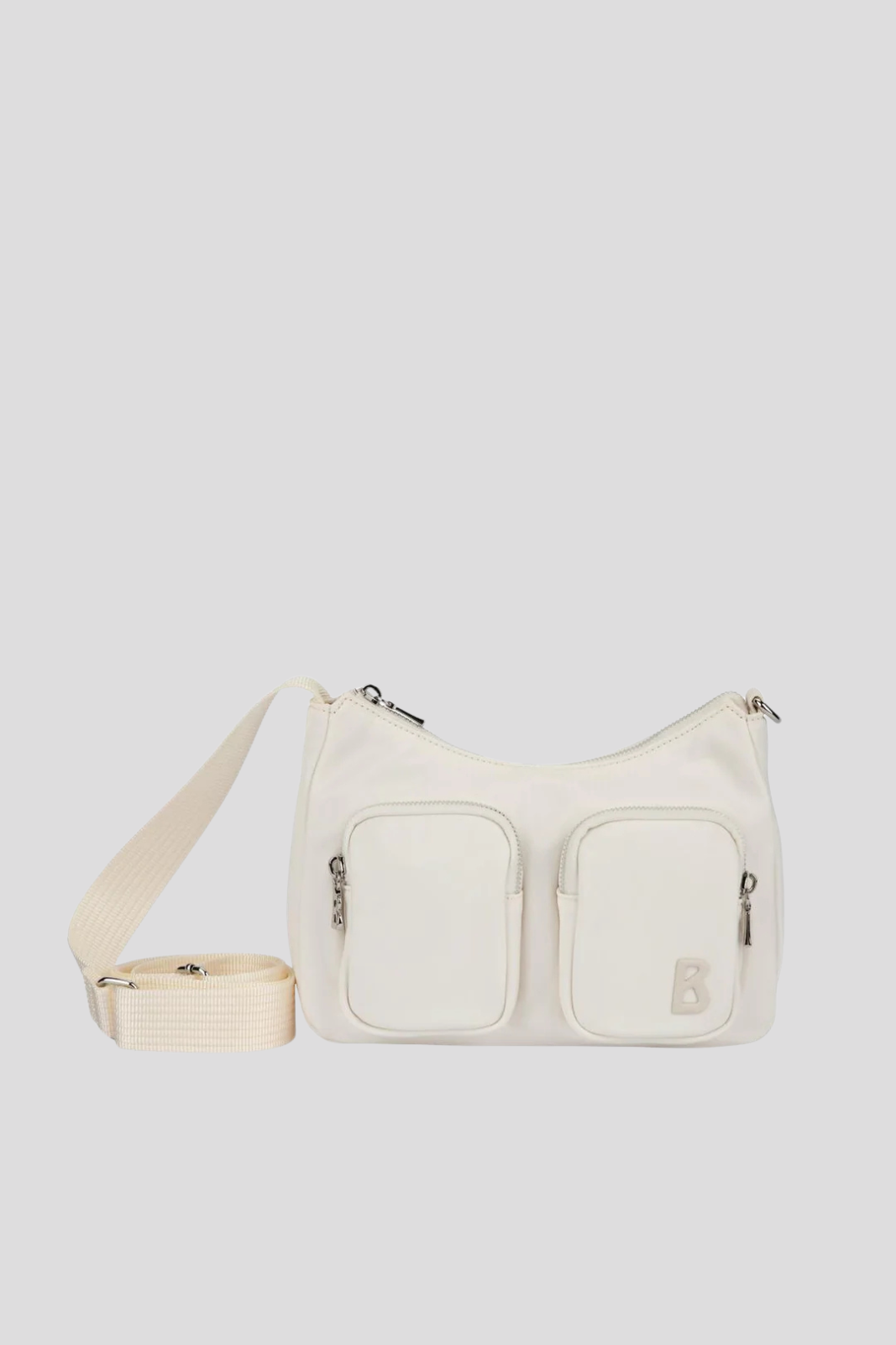 Закопчаването с цип и две външни джобчета с висулки с логото B осигуряват практичност