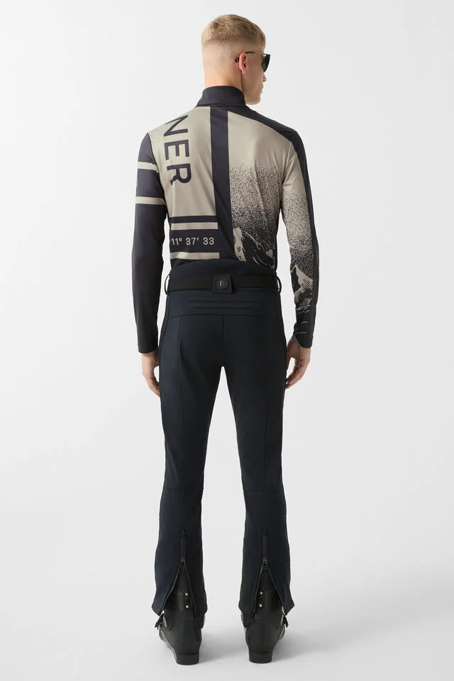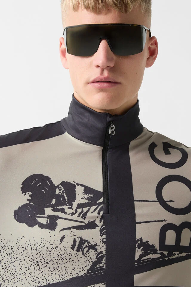 First layer in classic silhouette with motif print and accent logo, fitted with stand collar and short, padded B-neck with zipper-garage