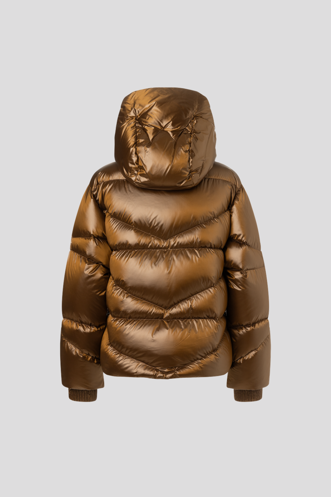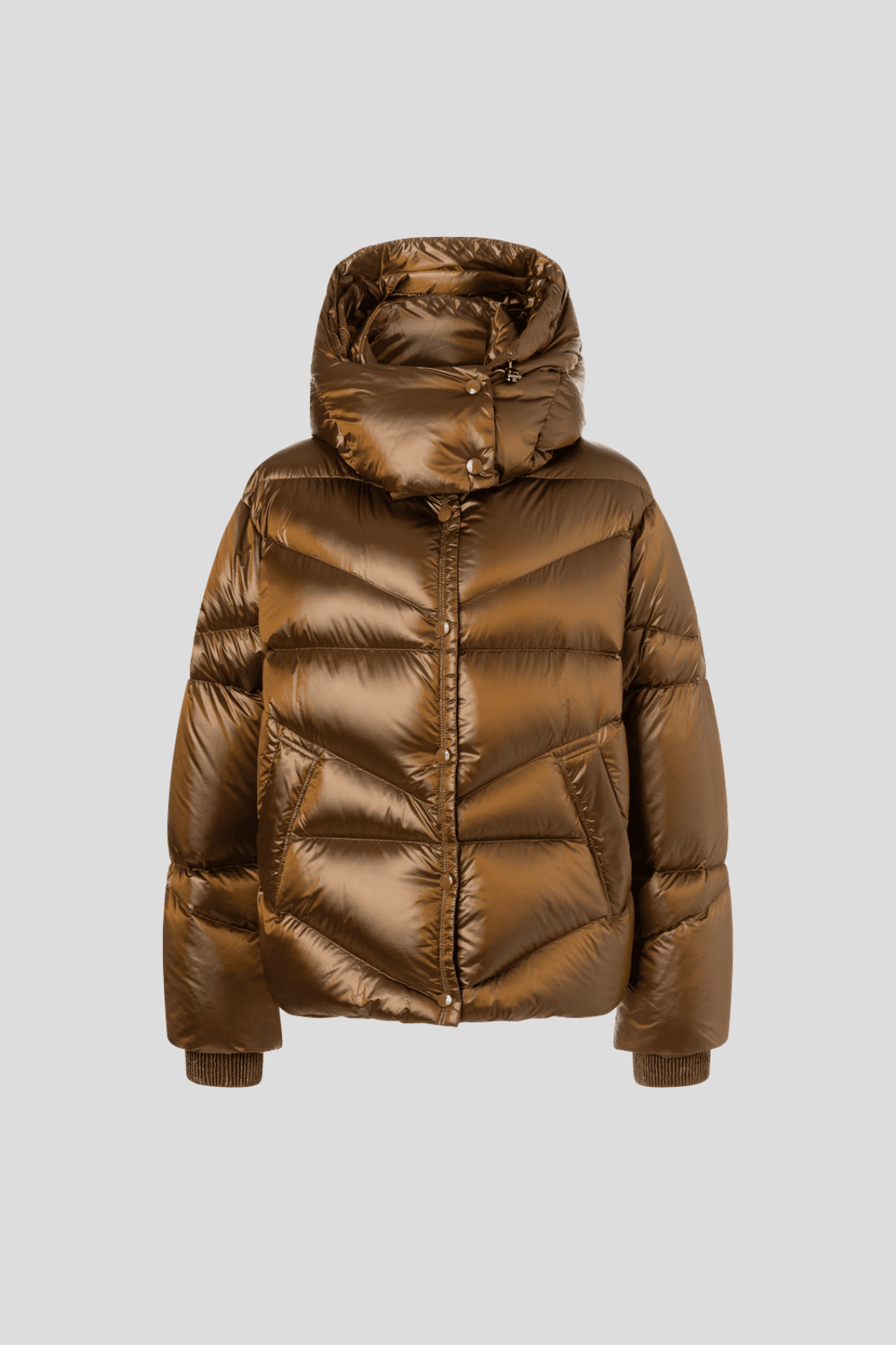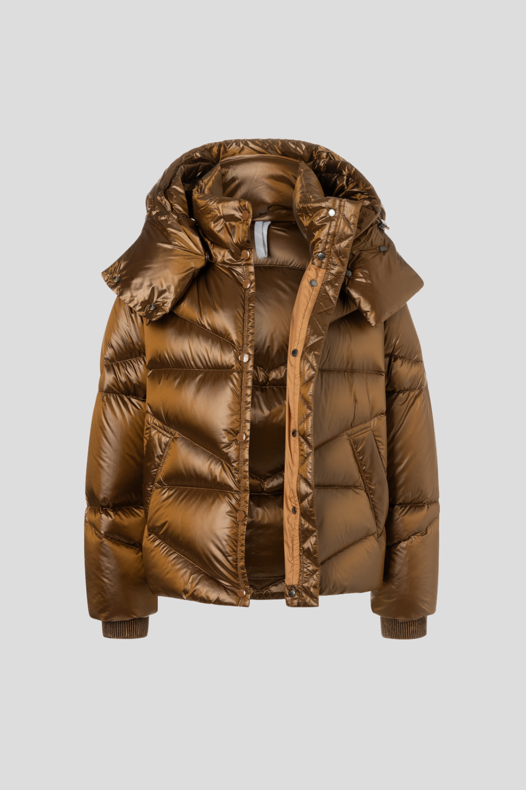 Women’s down jacket in a classic silhouette and premium craftsmanship, with padded collar and removable hood with adjustable ties and eyelets with embossed logo, hidden two-way zipper with B-shaped pendant